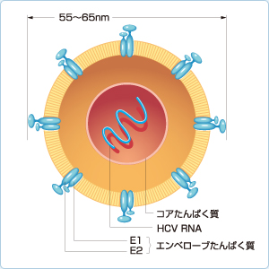 (HCVの電子顕微鏡像の模式図)HCVはエンベロープと呼ばれる外殻の膜構造とウイルスの遺伝子RNAとそれを囲むコアたんぱく質とからできています。 |