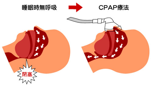 | CPAP(Continuous Positive Airway Pressure)療法です。鼻マスクを装着して、鼻から気道に空気を送り込む療法です。いわば、送り込まれた空気が舌根の周囲の軟部組織を拡張することで吸気時の気道狭窄を防ぐ、いわば気道を支える添え木の役割をするわけです。(右図) |