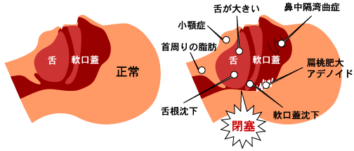睡眠中の筋弛緩により舌根部や軟口蓋が下がり気道を閉塞することが主な原因です。舌の付け根や軟口蓋と言われているところが気道へ落ち込んだり、首のまわりに脂肪がついたりアデノイドや扁桃肥大が原因となります。また、顎が小さい、顎が後退している(小顎症)が原因となることもあります。(右図) |