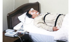 もちろん、このCPAP装置は夜間寝ているときのみ使用します。空気を送り込む圧力は患者さんの閉塞の度合いによって異なります。検査とは別にもう一日、圧力決定の検査を行います。検査にはポリソムノグラフィーとCPAPを装着しますが、この検査も痛みは伴いませんのでご安心ください。検査後、患者さんに適切な圧力値をCPAP装置にインプットして、お持ち帰りいただき、ご自宅で睡眠中にお使いいただきます。
