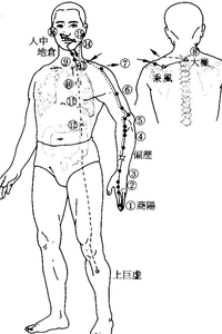 原穴、四総穴 「肚腹は三里に止め腰背は委中に求む。頭項は列缺に尋ね面目は合谷に収む。」『徐氏鍼灸大全』『霊枢』本輸 |